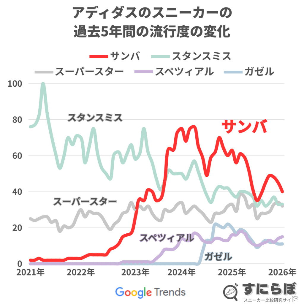 2026年時点でもサンバは他のアディダスのスニーカーと比べて検索の人気は一番高い
