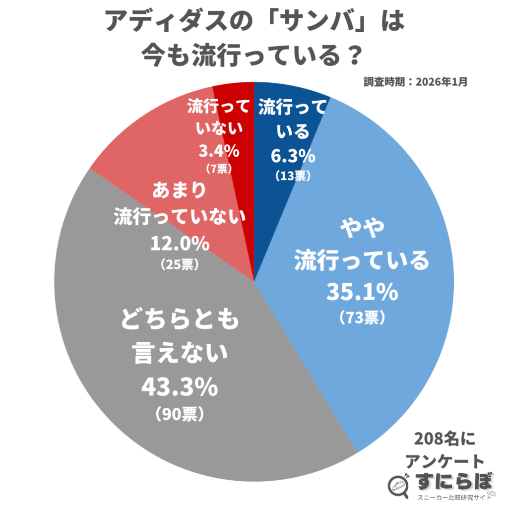 | 女性 | 35歳 | サービス業 | 流行っている | 2026年中まで | 最近はベーシックなデザインが長期に渡って流行っている印象。ベーシックなデザインのサンバはまだ流行りは続きそうな印象があります。 |