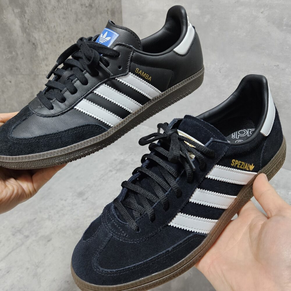 どちらもサンバに近い細身で薄底のシルエットで、今の流れに合っています。