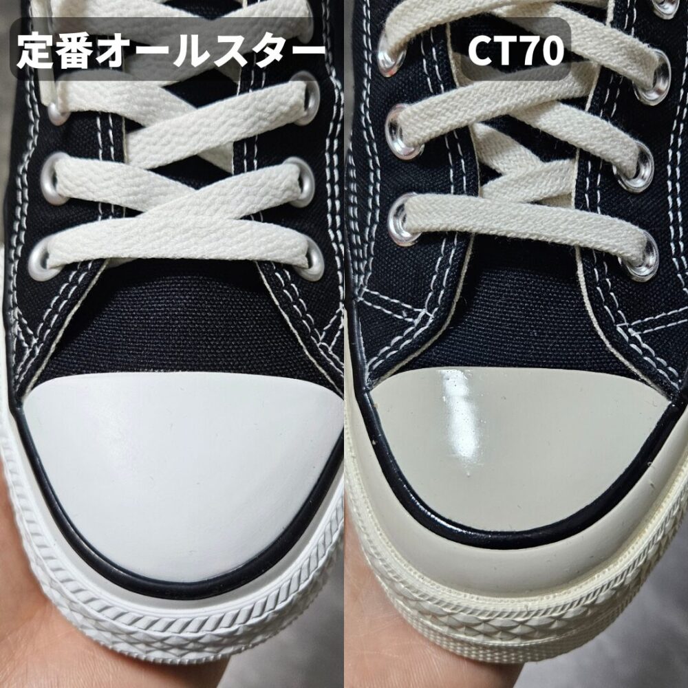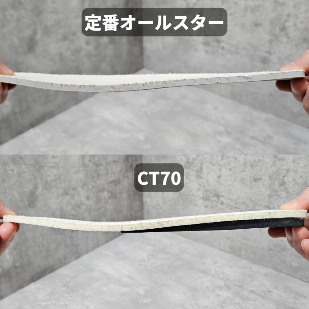 ただ、CT70のほうが生地に厚みがあり、ソール周りもややかたく感じられるため、長く良い形を保ちやすいのはわずかにCT70に分がある、という印象があります。
