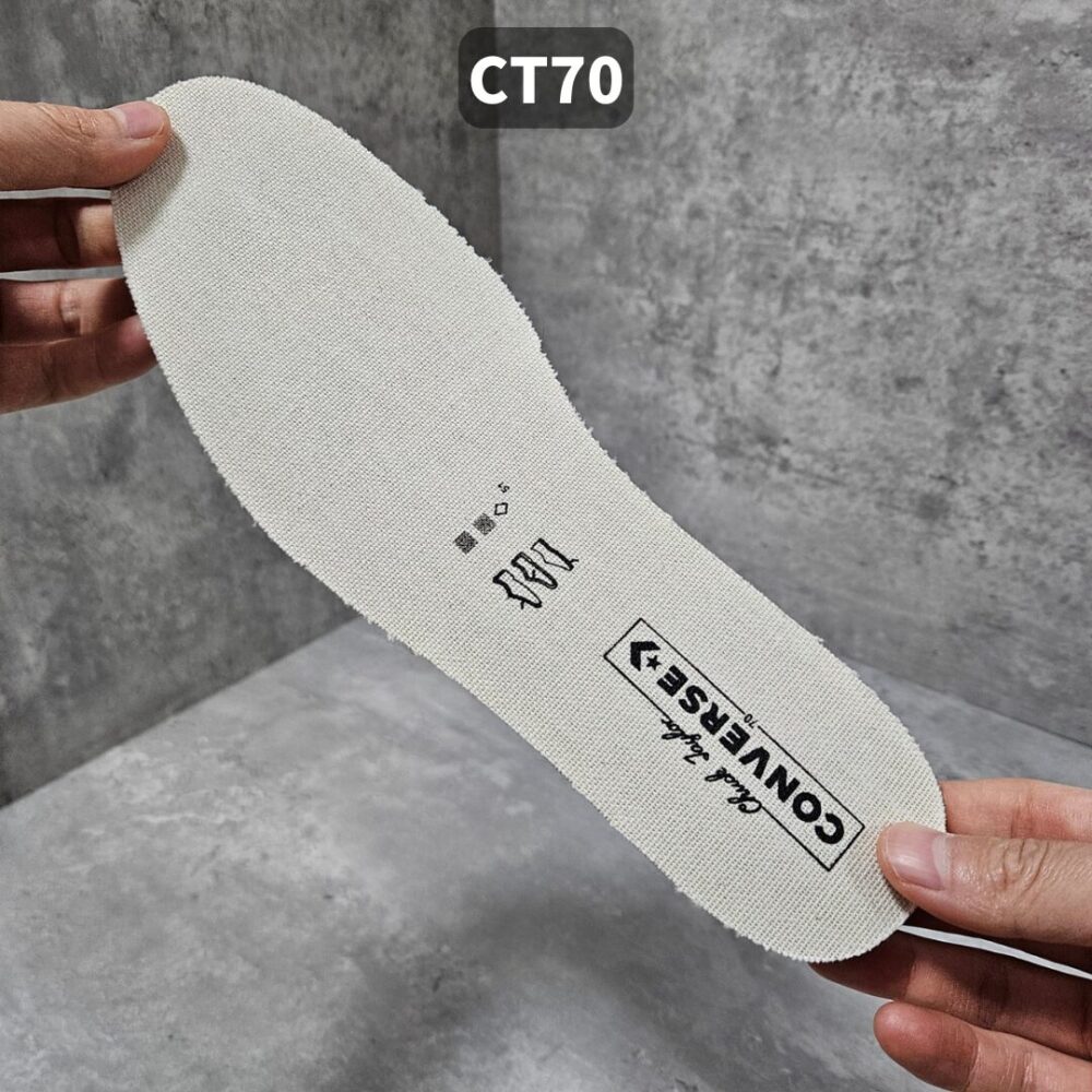 インソールを取り出して比較してみると、定番オールスターは柔らかいスポンジのような一層のみの構造ですが、CT70はその下に黒い弾力のある層があり、2層構造になっています。