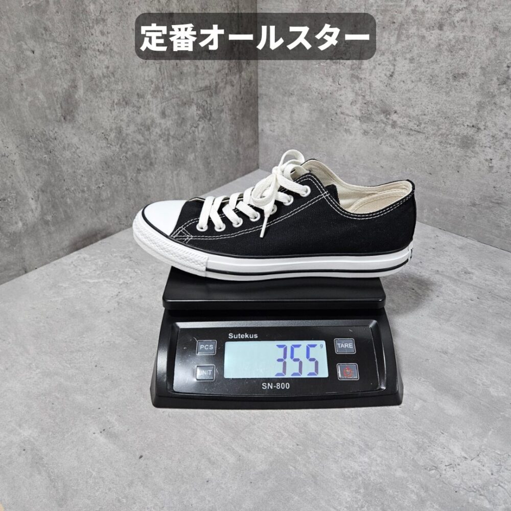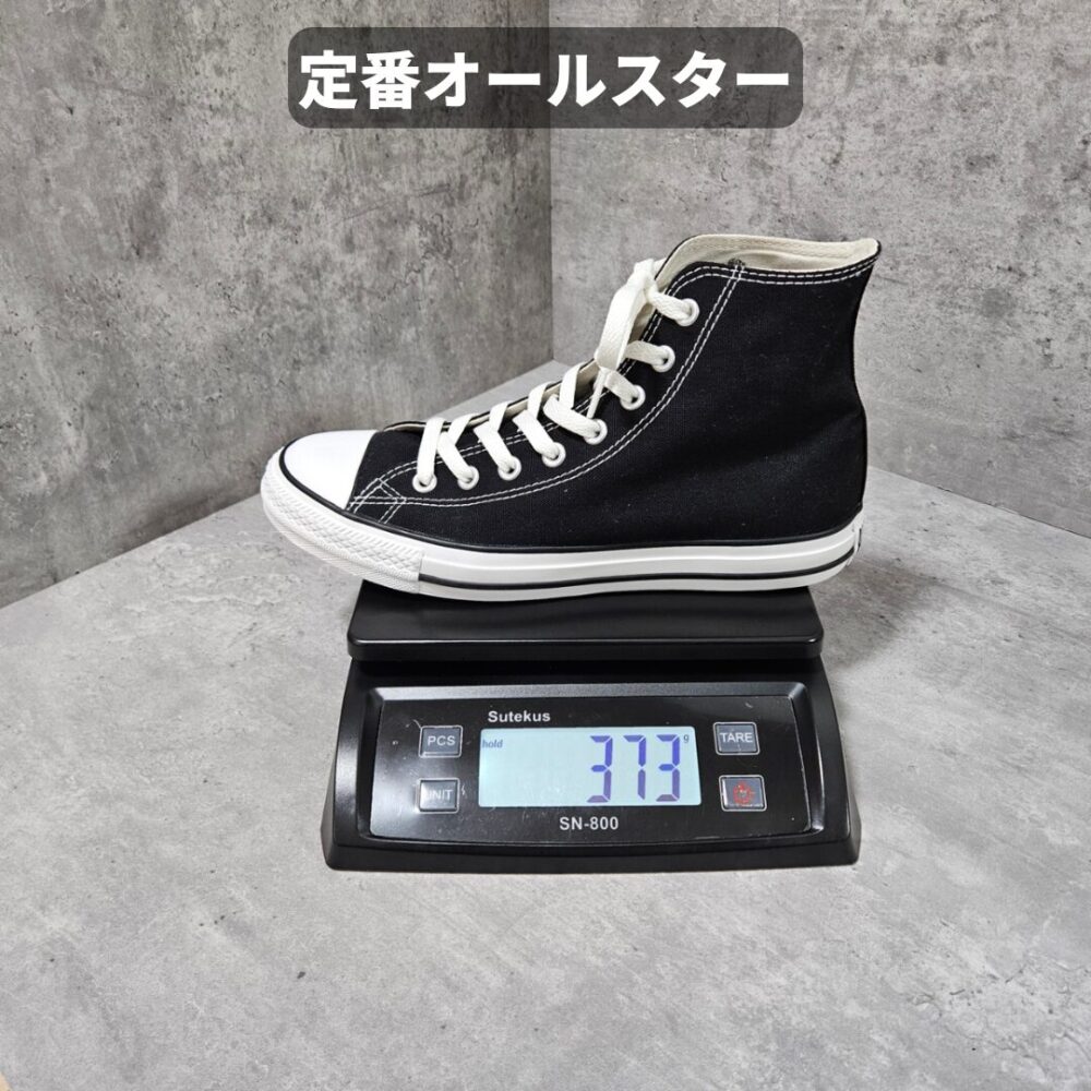 27.0cmサイズで比較したところ、定番オールスターのローカットは355g、ハイカットは373g。他の人気スニーカーと比べても平均的な重さです。