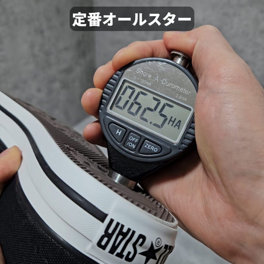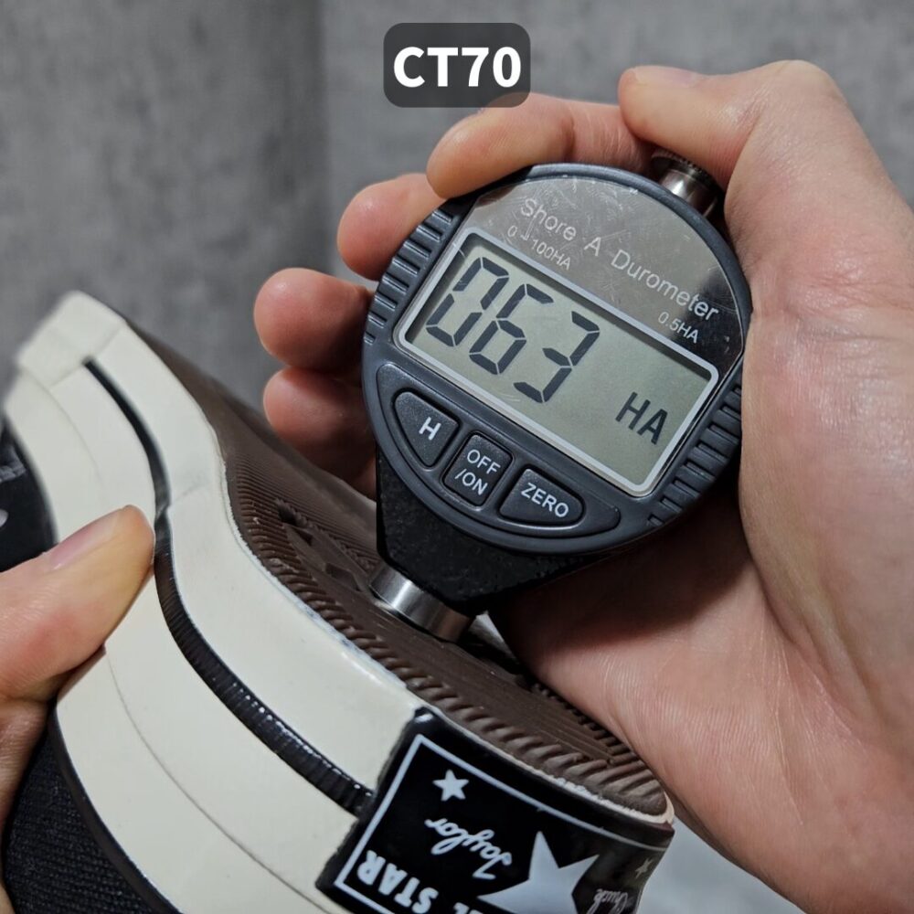 靴裏のアウトソール硬度もほぼ同水準で、定番オールスターは62.5度、CT70は63.0度です。
