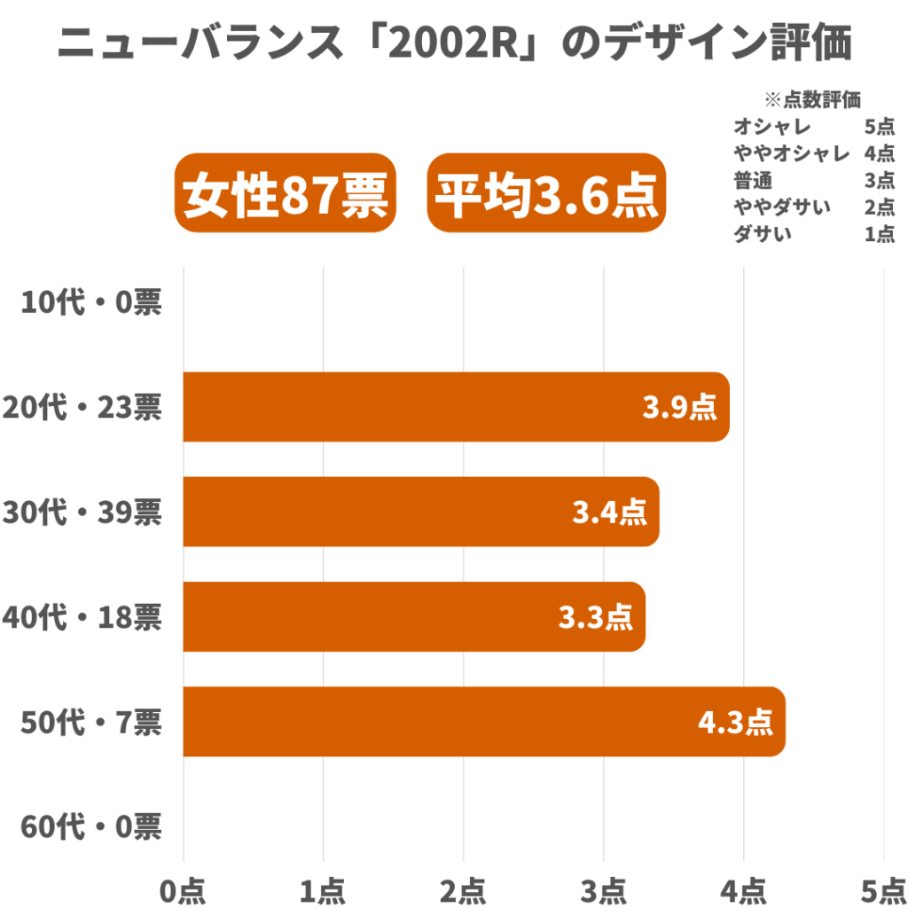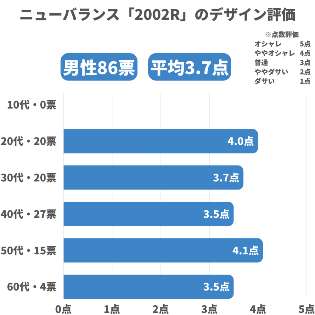 - 質問①「ニューバランス2002R」の商品の全体的なデザインおよび前面、側面、背面などの各角度からの画像を参考に、以下の5段階評価でデザイン性を評価してください。