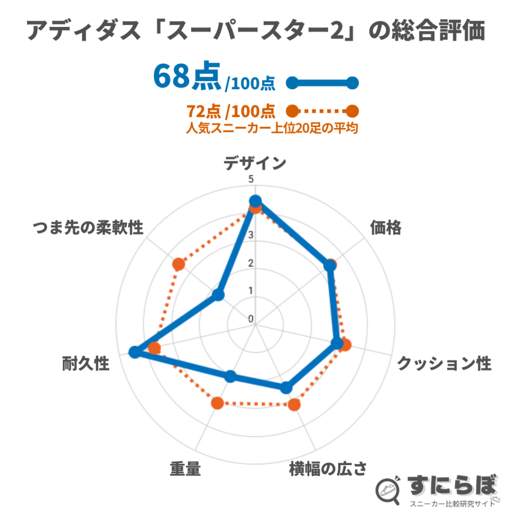 | アディダス スーパースター ![]() | 45票 | Amazonで見る 楽天市場で見る | 69点/100点![]() | 10,890円 | 流行に左右されずずっと愛用したい一足 | 4.4/5.0点 | 3.8/5.0点 | 2.8/5.0点 | 2.2/5.0点 | 2.5/5.0点 | 4.4/5.0点 | 1.7/5.0点 |