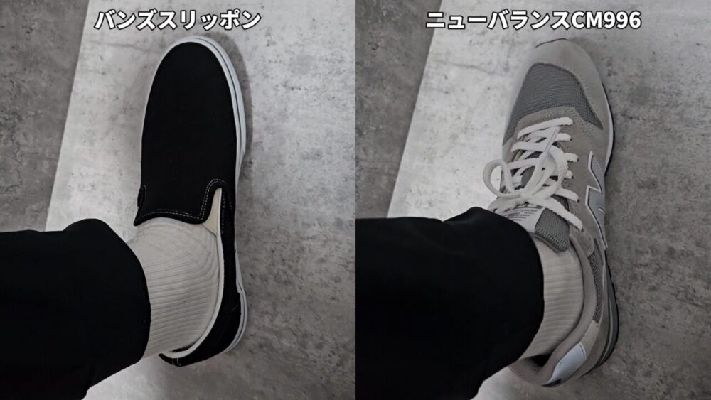 - バンズスリッポンとニューバランスCM996のサイズ感を比較