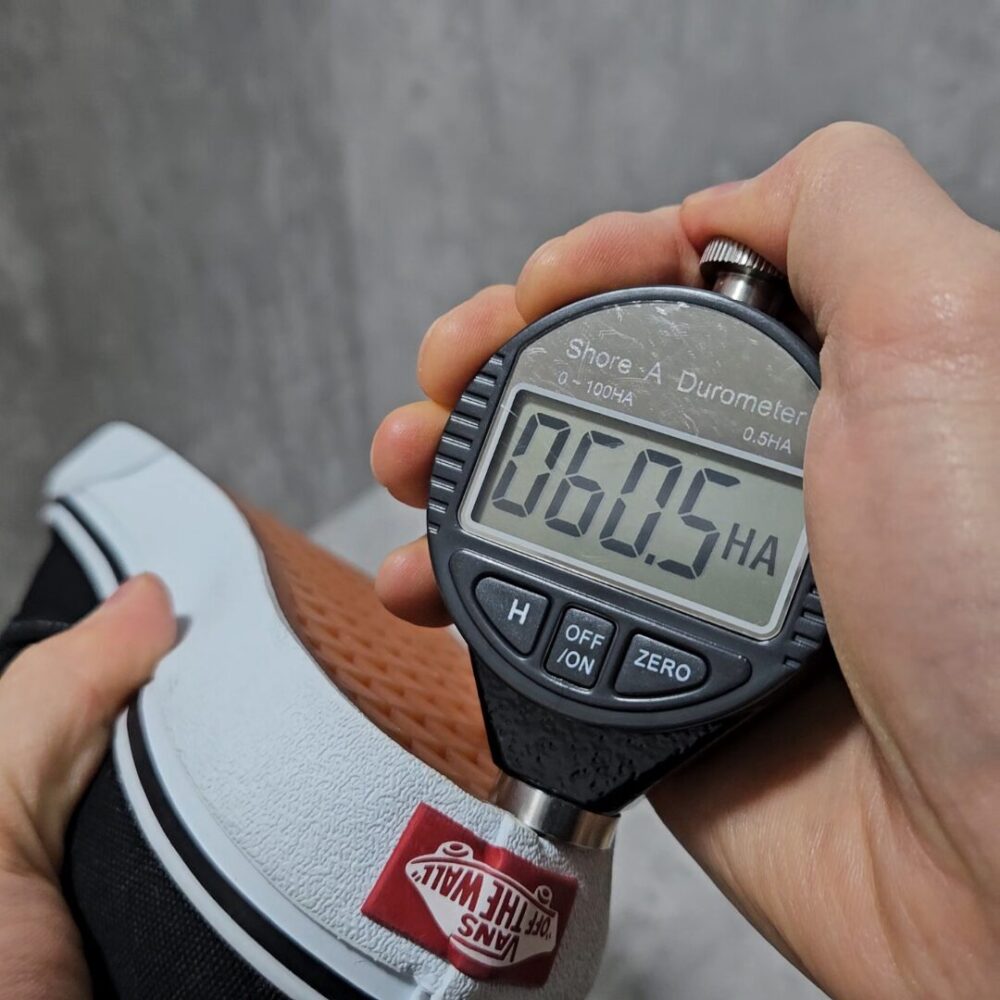 アウトソールの硬度は60.5度で、他のスニーカーと比べると少しやわらかめです。やわらかいぶん、少しかかとの減りは早いかもしれません。